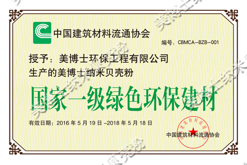 中國建筑材料流通協(xié)會(huì)又授予美博士納米貝殼粉國家一級(jí)綠色環(huán)保建材稱號(hào)。有效日期從2016年5月19號(hào)到2018年5月18號(hào)。
