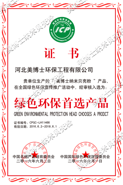 以其得天獨厚的優(yōu)勢,河北美博士環(huán)保工程有限公司生產的“美博士納米貝殼粉”產品在全國綠色環(huán)保宣傳推廣活動中,于2016年6月1日和2日經中國名牌產品培育委員會和中國國際綠色環(huán)保管理委員會審核入選為綠色環(huán)保首選產品,有效期為2016年6月2號至2018年6月1號。